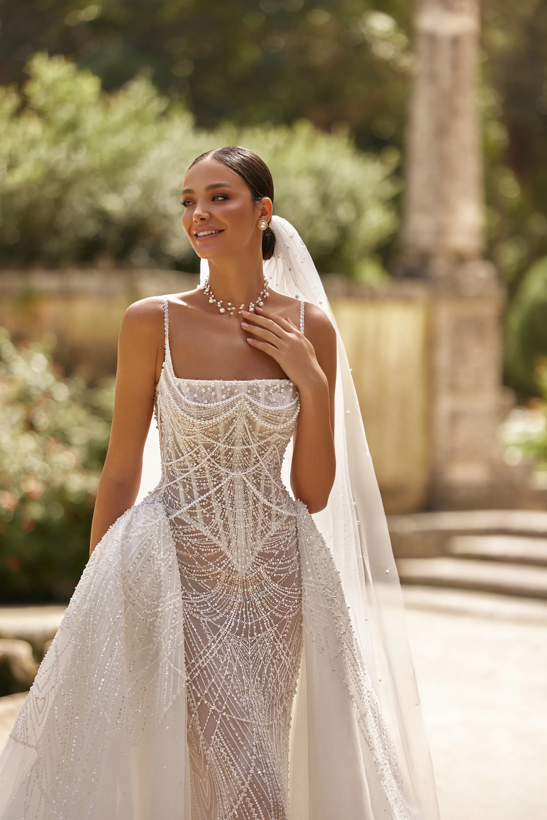 Hiljade ručno šivenih bisera i detalja koji blistaju čine da sija – čak i u senci.