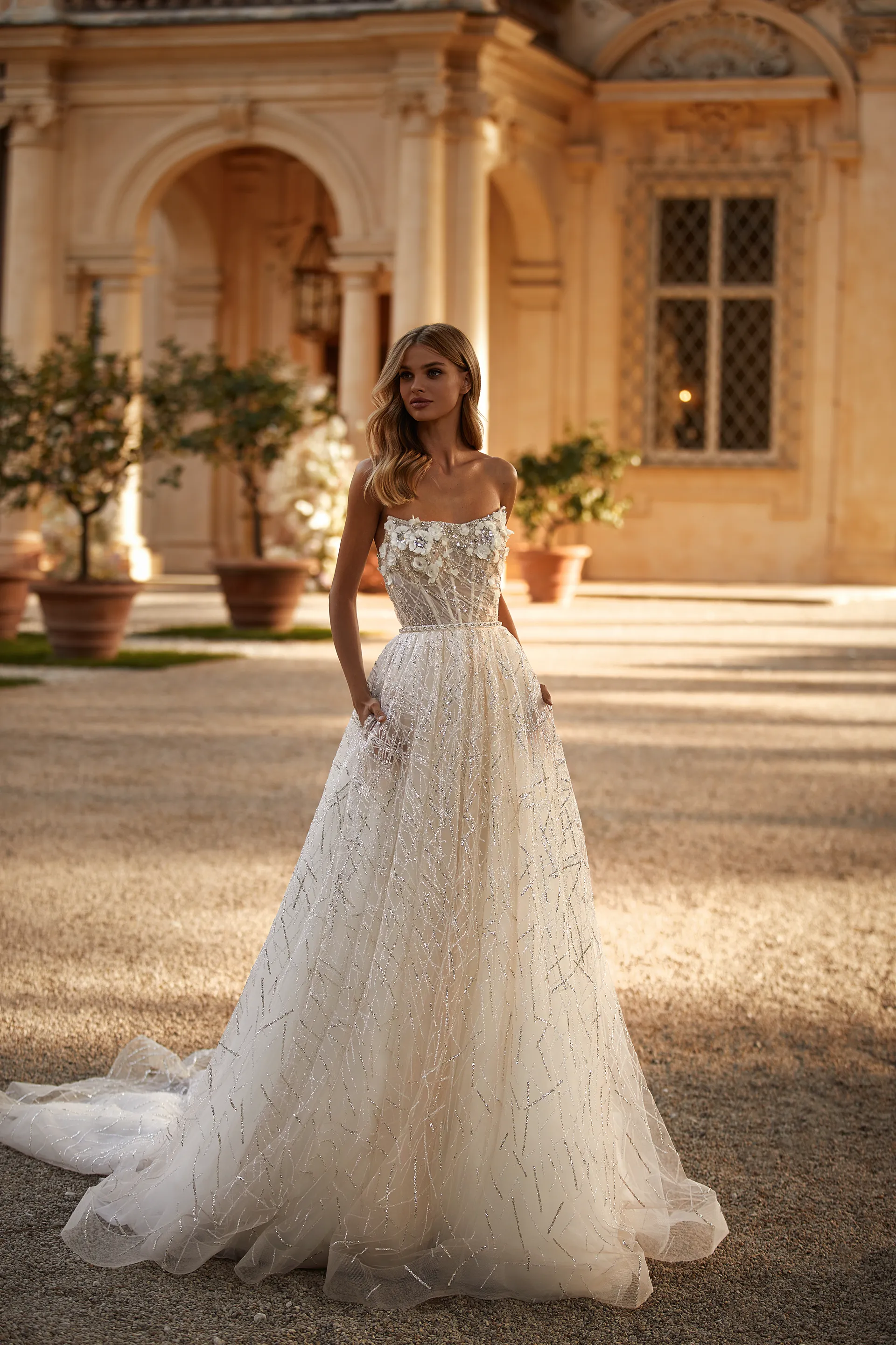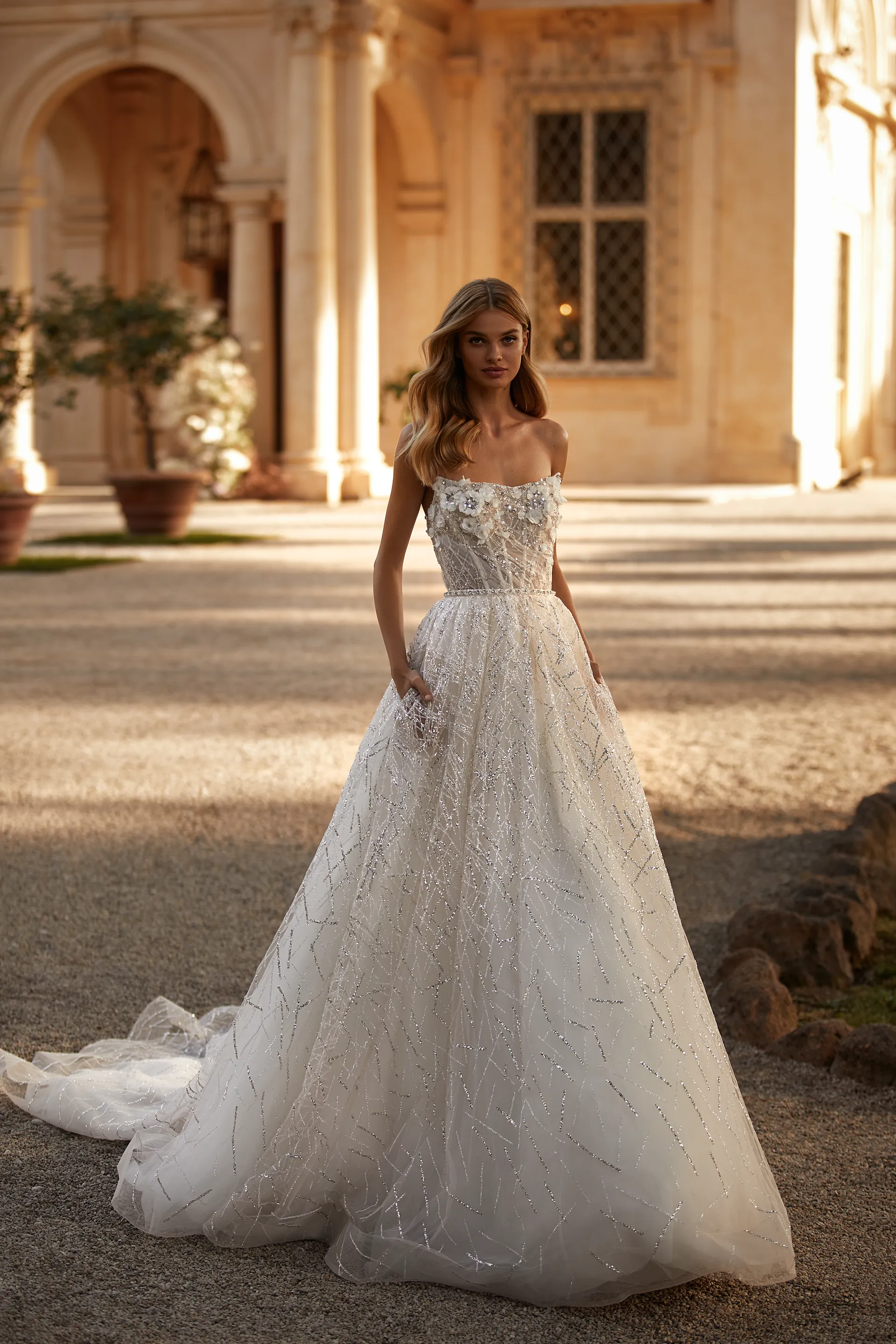 Prelepa venčanica bez bretele sa raskošnim perlama i princeza suknjom. Birajte između šniranja ili rajsferšlusa na leđima. Idealan izbor za tradicionalnu i romantičnu mladu.